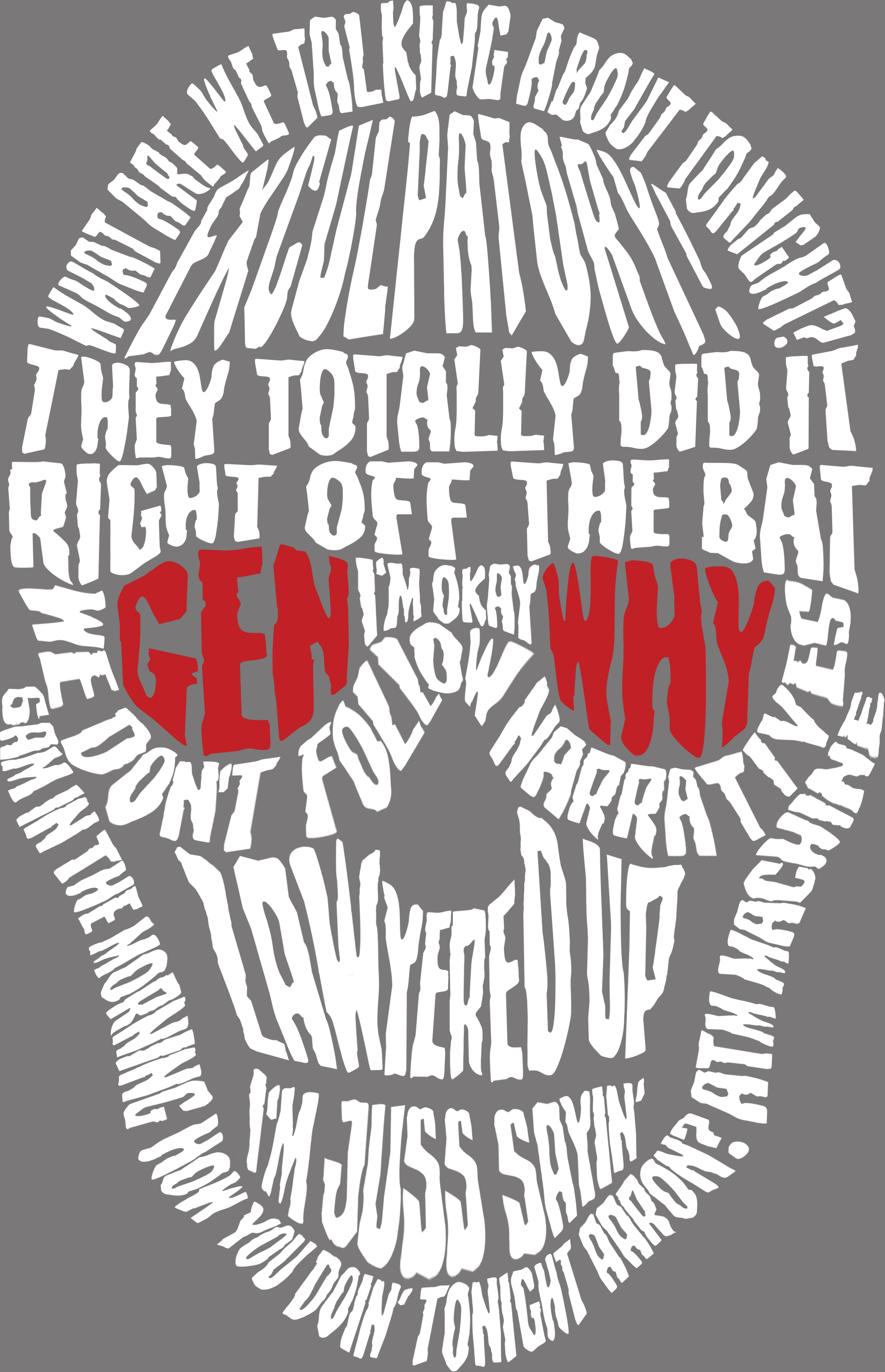 A removable clear vinyl sticker of a creepy skull designed with sayings from Justin and Aaron. This sticker is approximately 5 inches by 3 inches.